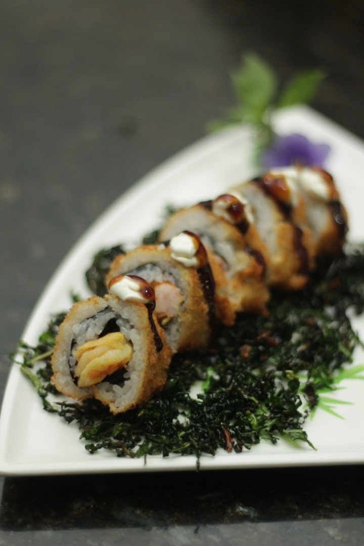 Hot roll na massa de pastel com recheio de salmão grelhado, skin, cream cheese, kani, tomate seco e molho de laranja.